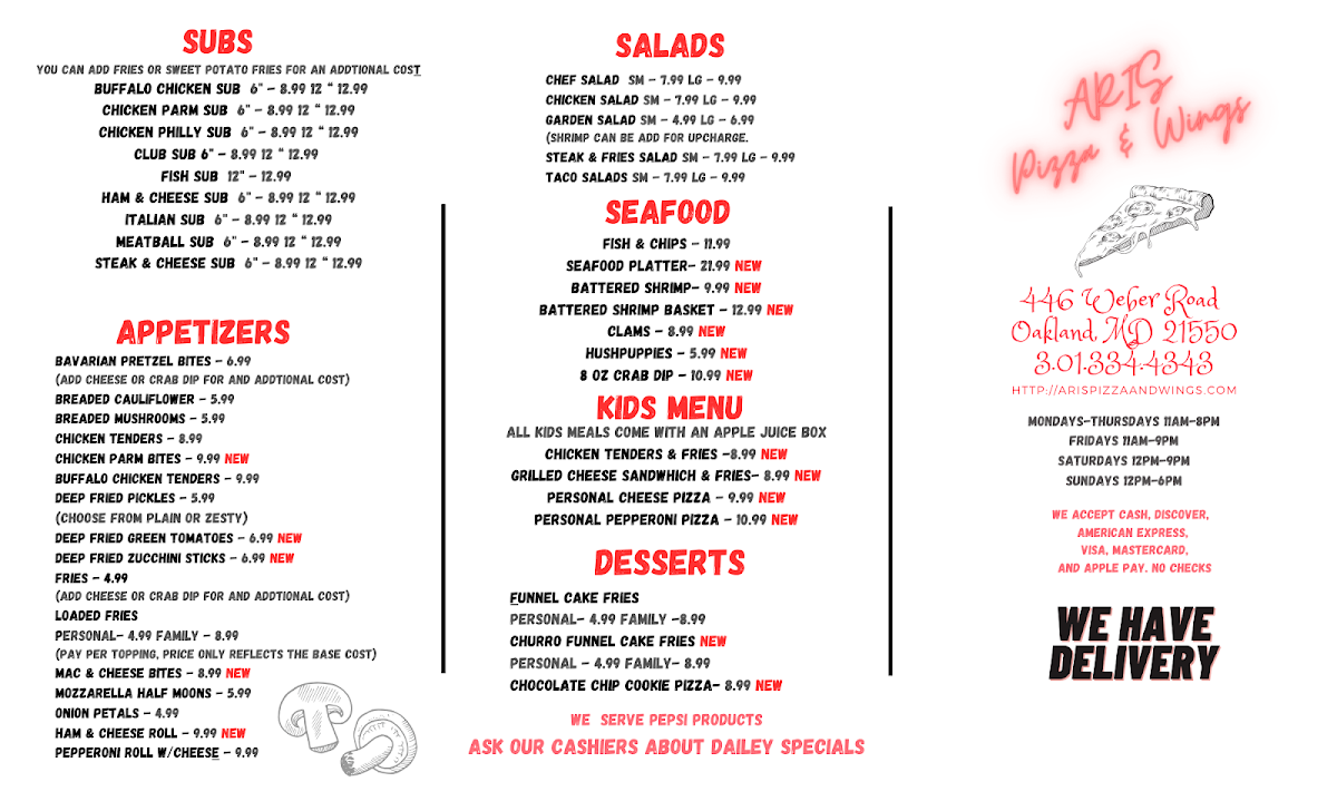 Welcome to Ari's Pizza, located at 446 Weber Rd, Oakland, MD. Ari’s is not just a pizzeria; it's a community hub celebrated for its exceptional service and vibrant menu. The heart of the menu lies in its scrumptious appetizers like the mozzarella half moons and loaded fries, all crafted to perfection.